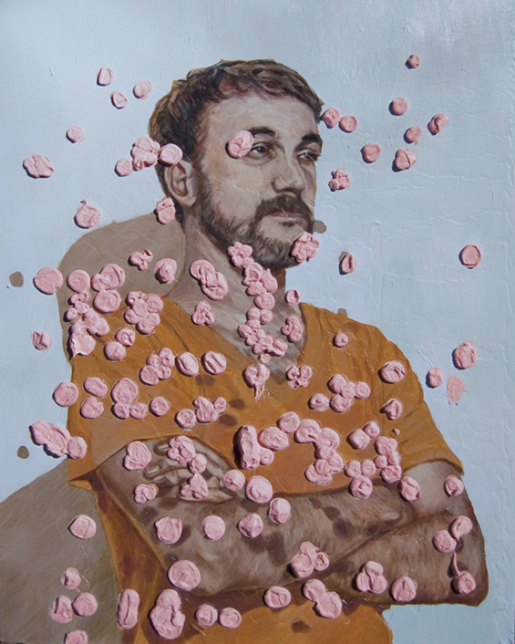 Jason (Con.t): So, I called up a photographer buddy of mine, Matt Wright, up in Austin, and we spent an afternoon capturing images of me as I had a box of cotton balls dropped over my head. My plan was to paint from the photographs, but to assert the surface of the painting in those areas where the cotton balls were, so that the picture plane would actively play a role. Afterwards, I made similar images of my friends and family. Visible Inclusions in an Obscure Plane has my friend, David Alcantar in it.