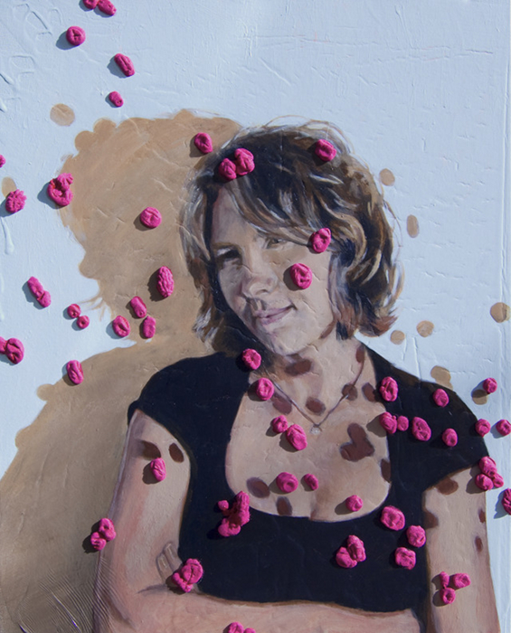 So to push those objects further out of context, I flocked them to change their texture… make them fuzzy. Totally worked. The flocked paint-objects work pictorially, as they seem to be casting shadows on the figure in the painting, but equally they work to emphasize the surface of the picture plane.