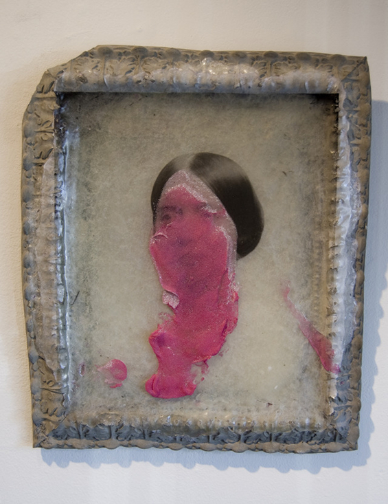 The ornamental frames are made with pouring, too, as I’ve cast them out of cement. So, there’s a kind of fluidity to these pieces that’s interesting. The image overflows out of the frame, and the frames look soft and distorted. But then the Glitter Bomb alters the image space, too. I used another pour of fluid acrylic paint, and flocked it with nylon and glitter to liken it to what I had seen in the paparazzi image.